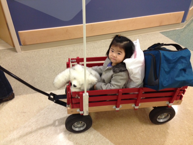 This was discharge day! She was happy to leave this place. Especially if it meant a ride in this red wagon!